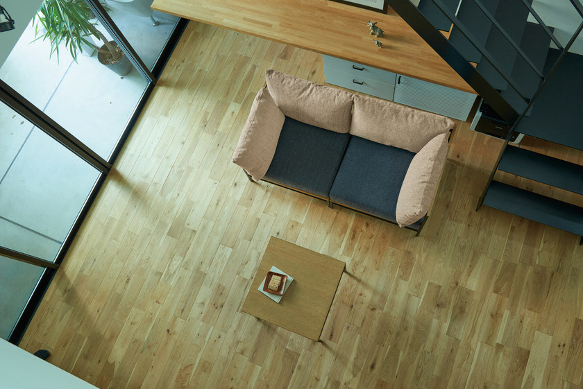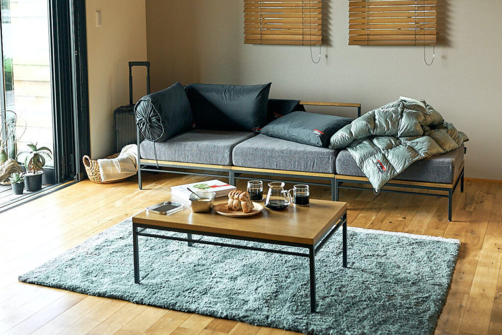 リビングの主役的存在であるソファがアウトドアのエッセンスを纏い、個性的なリビングシーンを演出します。