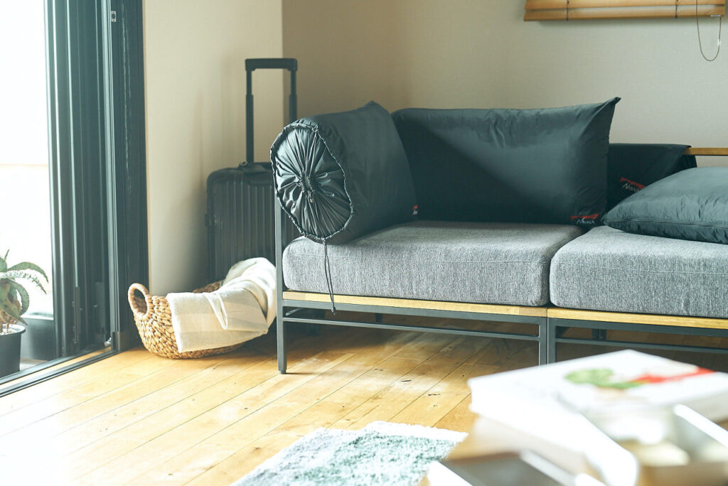 NANGA × ADRSカーラソファ スペシャルエディションの一番の特徴は、シュラフをイメージさせるスタッフサック型のクッション!
