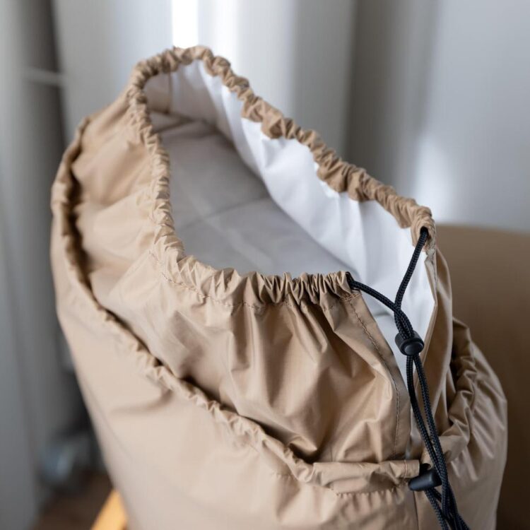 カバーの開閉は、スタッフサックのように巾着のコードをしめる仕様です。