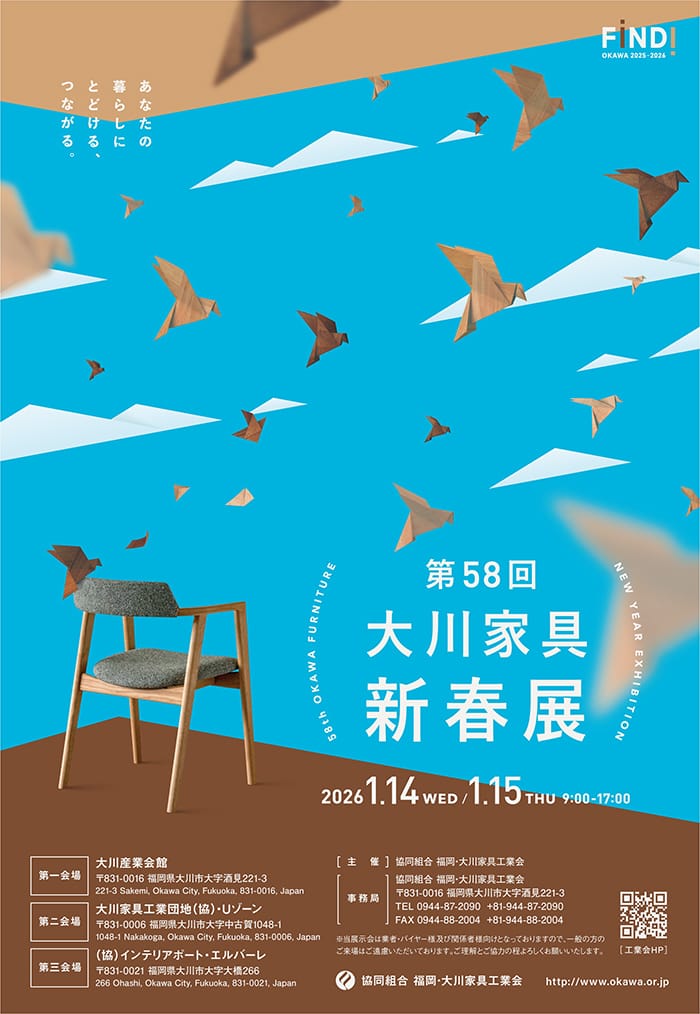 この度、2026年1月14日(水)、15日(木) に福岡県大川市にて開催される『第58回大川家具新春展』 に出展いたします。